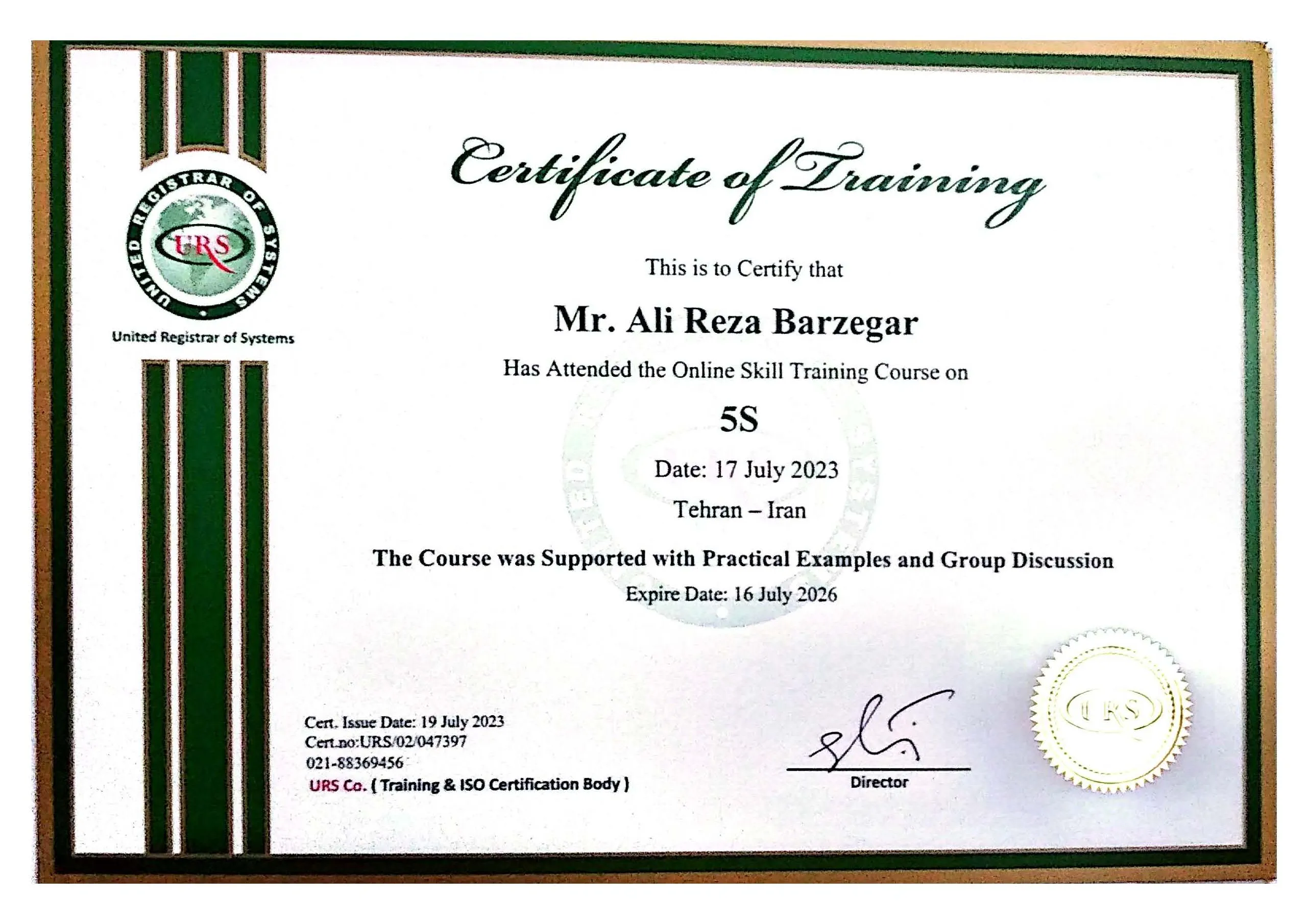 گواهینامه 5S نظم بهرهوری و ایمنی در محیط کار