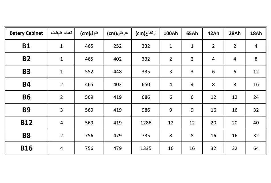 🟢جدول سایز خارجی کابینت و تعداد باتری قابل استفاده در آن: