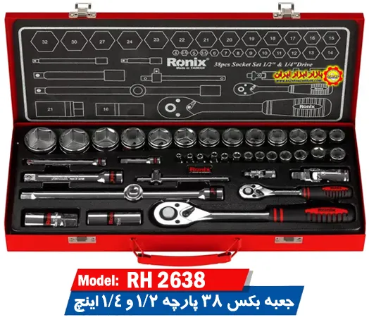 🔧 اگر بهدنبال یک ست بکس حرفهای، کامل و بادوام هستید، همین حالا بکس 38 پارچه 1/2 و 1/4 اینچ رونیکس مدل RH-2638 را از بازار ابزار ایران تهیه کنید.